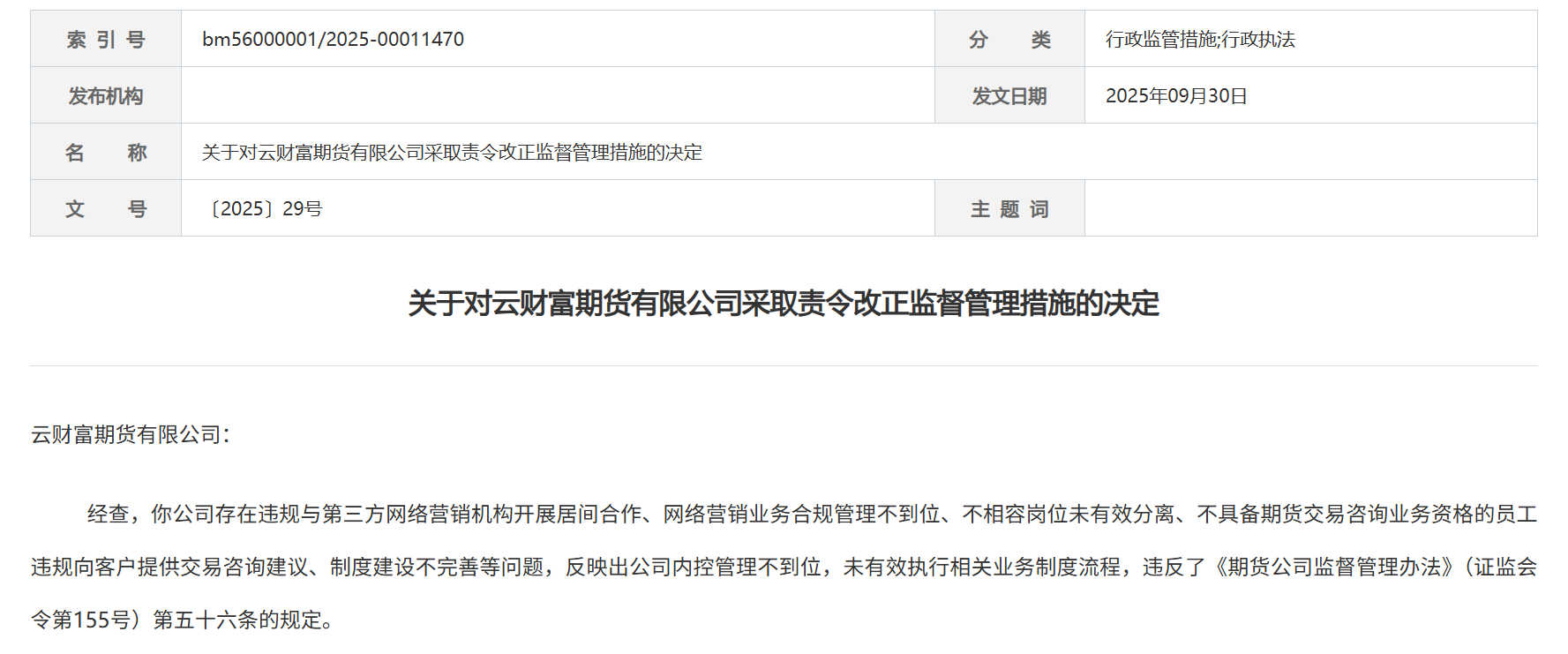 经查,该公司存在违规与第三方网络营销机构开展居间合作、网络营销业务合规管理不到位、不相容岗位未有效分离、不具备期货交易咨询业务资格的员工违规向客户提供交易咨询建议、制度建设不完善等问题,反映出公司内控管理不到位,未有效执行相关业务制度流程,违反了《期货公司监督管理办法》(证监会令第155号)第五十六条的规定。